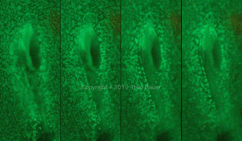 Die zweite Montage von Abbildungen zeigt Details der Mundregion in verschiedenen Ebenen des Fokus von links nach rechts tiefer hinabsteigend in den Schlund der Mundöffnung hinein. Das ER ist kein starres Gebilde, sondern es wird in den Zellen permanent umgebaut. Von dem ER erkennen wir hier die gefärbte Oberfläche seiner räumlichen Membran. Zeitreihen-Aufnahmen lassen nicht nur die 3D-Struktur des inneren Zellaufbaus erkennen. So sind hier nicht nur die räumliche Struktur des ER, sondern auch subtile Unterschiede des veränderlichen Netzwerks von Membranen zu erkennen.