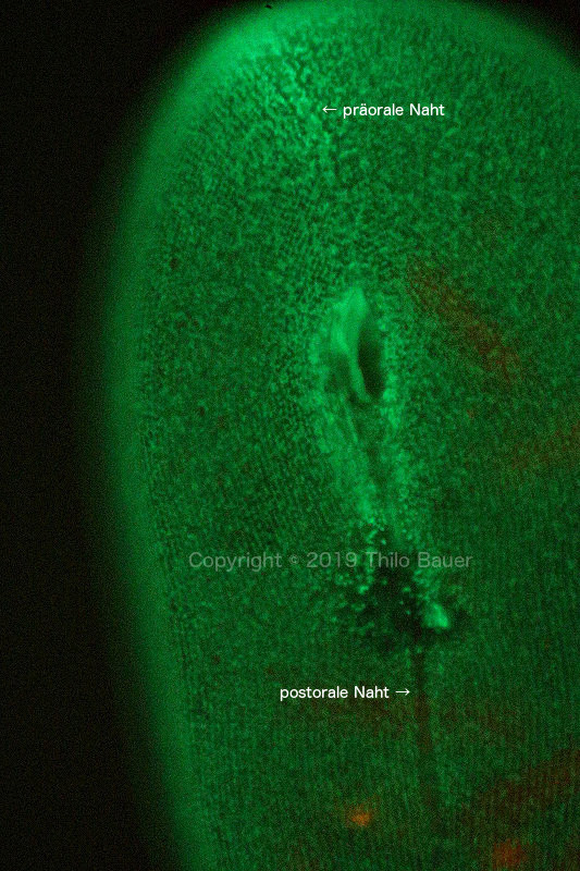 Frontonia leucas ist ein recht großes, einzelliges Wimpertierchen (Ciliata, Phylum: Ciliophora), das gelegentlich eine Länge von bis zu 600 µm erreicht. Dieses große Exemplar konnte nicht vollständig mit einem Objektiv 40x abgebildet werden. In der Fluoreszenzfärbung lassen sich Vitalfunktionen in der lebenden Zelle studieren. Reticulum ist übersetzt das Netz, welches hier sehr schön regelmäßig erscheint. Die Strukturen des ER folgen hier den Reihen der Wimpern, die der Fortbewegung dienen. In dieser Aufnahme mit Blick lassen sich sehr schön auch die prä- und postorale Naht erkennen. In dieser Linie enden die Cilienreihen und lassen eine "Naht" erscheinen.