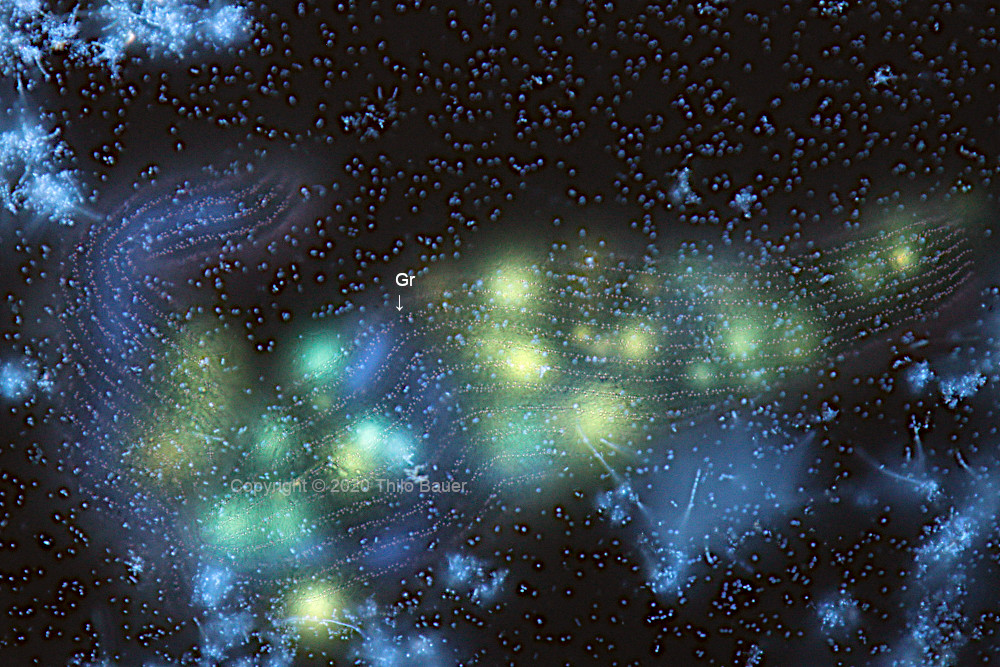 Abb. 3: Die kortikale Granula (Gr) von Spirostomum Arten wird von Acridinorange in Farben von Grün über Gelb bis Rot gefärbt, was den Ionenfallen-Mechanismus dieser sauren Organellen auch in der Fluoreszenzfärbung bestätigt.