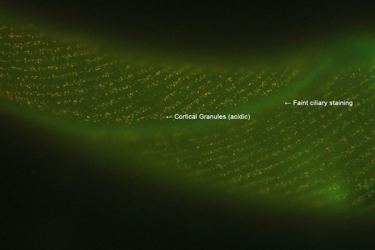 Die mikroskopische Beobachtung von Spirostomum sp. lässt verschiedene kleine Organellen unter der Kutikula erkennen. Mit Neutralrot gefärbt erscheint die kortikale Granula von Spirostomum sp. rot gefärbt, also sauer.
