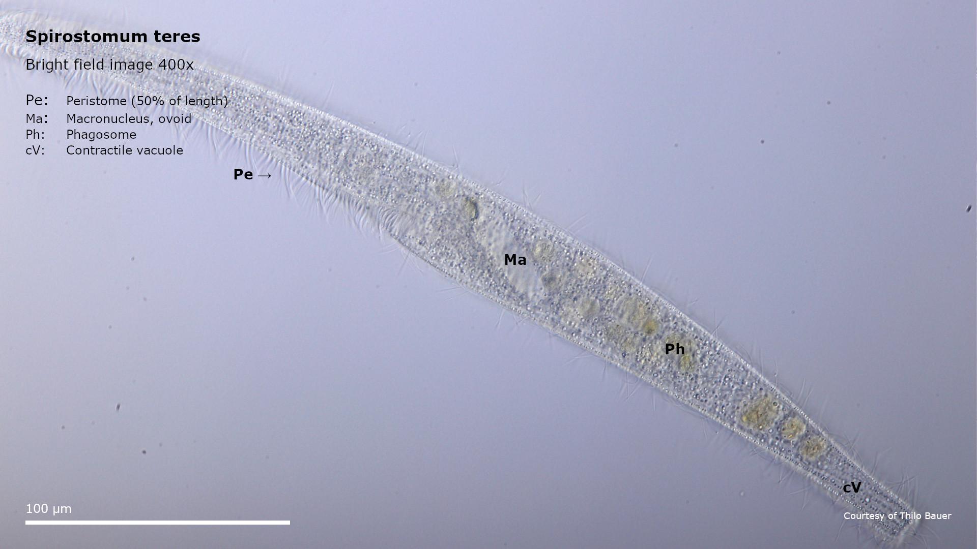 Spirostomum teres besitzt eine Länge von 300-600 µm und gehört damit zu den kleinen Spirostomum Arten, die dennoch mit dem bloßen Auge oder einer Lupe sichtbar ist. Spirostomum teres ist einfach zu halten und zu vermehren. Es lassen sich viele Versuche anstellen, beispielsweise: