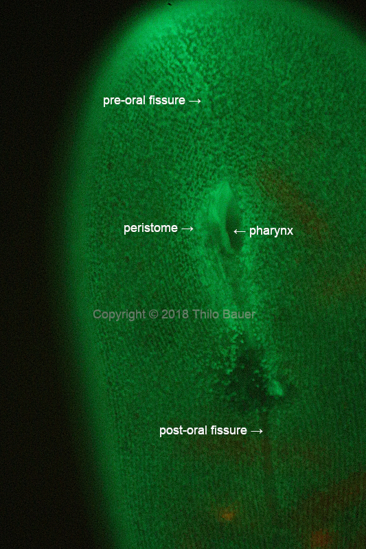 The second image shows details of the peristome when viewed from top of the pellicle to the inner opening. Different depth of the focal planes demonstrate the 3D structure of the pharynx. The endoplasmic reticulum is not a fixed cell organelle, but is constantly changing. This time series was recorded with a conventional digital single-reflex camera. Slight changes of the ER are clearly visible. Also the time series shows slight changes and movement of the pharynx itself.