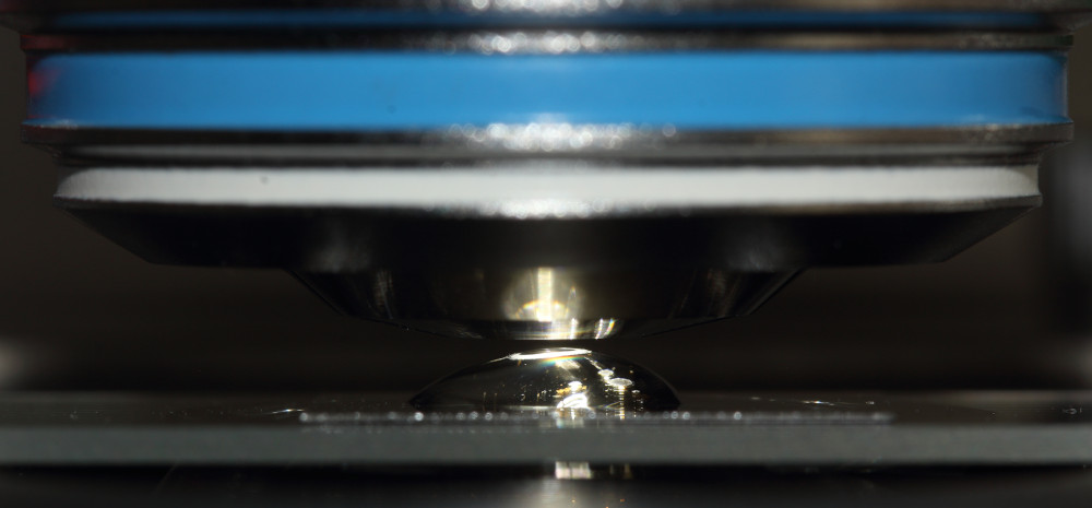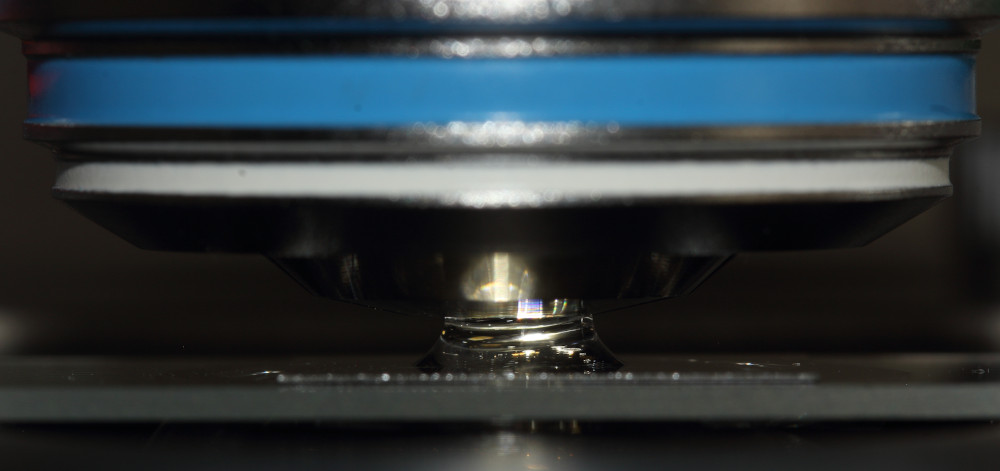 Now carefully focus the sample. A limiter at the specimen stage should avoid to break the cover slide. It shall be properly adjusted. If you don't know proper adjustment of the height limit take care while focussing the sample preparation. After a while you will get more and more experienced with this special preparation and love the brilliant image quality, a water immersion objective will provide.