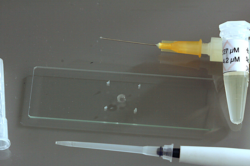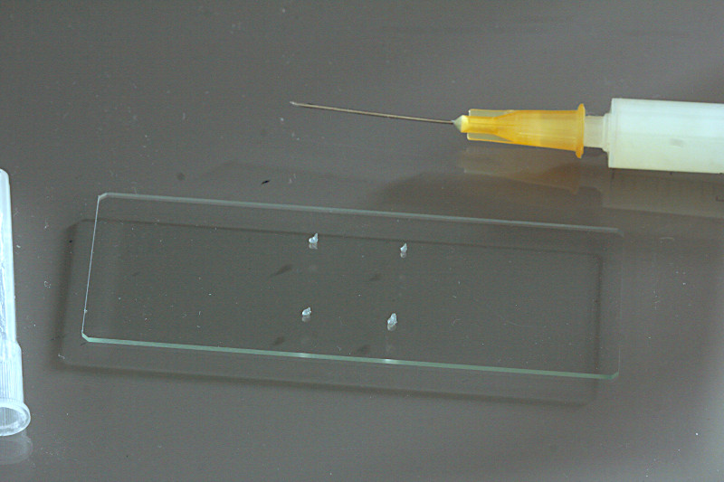 A typical preparation of the specimen slide using vaseline dots will be shown here. With the tip of the syringe injection needle small dots of vaseline are placed at the corners of the cover slide. A self-made printed gauge on a sheet of paper may support proper placement of the vaseline dots.