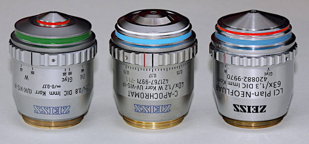 Figure: Modern water immersion objectives with magnification 25x, 40x und 63x. A correction collar allows for compensation of cover slide thickness. Left: Objective LD LCI Plan-Apochromat 25x/0,8 for multi-immersion (water, glycerol or oil). Right: Objektives of high aperture and magnification with temperature compensation and heat insulation: C-Apochromat 40x/1,2 W and LCI Plan-Neofluar 63x/1,3 DIC. Temperature compensation for 23°C is indicated by a black mark and 37°C is indicated by a red mark, respectively.