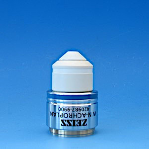 Water immersion objektives are special optics, that are optimized for observations of water preparations, like cell cultures or tissue samples, plankton samples, yeasts, fungus or water preprations of fresh plant tissue dissections. Water samples result in problems when using dry objectives or oil immersion objectives. Because the diffractive index of the water medium is different from air or oil, spherical aberration will occur. Different light beams from the sample focal plane to the objective will be diffracted differently. This results in blurred images lacking contrast. This problem will be solved by water immersion objective: They are constructed in a way, that they will be immersed using a drop of water. This avoids different light paths from observation of water samples and thus provides superior image quality, even if the focal plane is found deep below the cover slide in the sample.